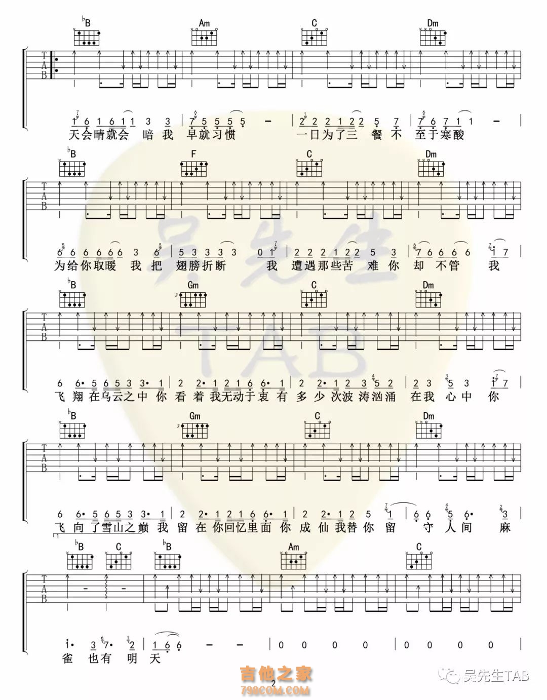 麻雀吉他谱F调 李荣浩【吴先生TAB】 “飞太慢会落单 太快会受伤 日子不就都这样 天会晴就会暗 我早就习惯 一日为了三餐 不至于寒酸” 李荣浩2019年12月5日,也就是今天最新发布的单曲《麻雀》,用麻雀映射出当下人们的平凡生活,歌词中的挫败与无奈不是让大家对号入座,而是给人以慰藉,听到的是故事,得到的是勉励。 有时候我们总想给自己找一个目标却怎么也找不到,或许我们和麻雀的理由一样,奋斗不是为了什么目标,就仅仅只是为了活下去,渺小而又强大,脆弱而又顽强。 有时,我们可能脆弱得一句话就泪流满面;有时,也可能因为一个执念默默咬牙走了很久。 “麻雀也会有明天”道出了每个怀揣梦想的人们对未来美好的憧憬。听懂他的歌的人会知道,生活不可能像你想象得那么好,但也不会像你想象得那么糟。 我们和生活在城市中的麻雀一样 虽然渺小 但是五脏俱全 感情 思想 理想 令我们成为 人群中的一只只麻雀