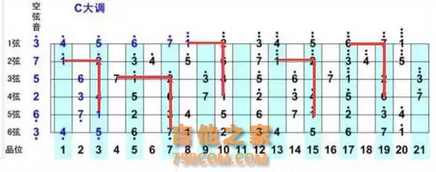 知道一个音后,往下推3条弦,再往左走2个品即可找到爸爸,同时反过来爸爸也可以找儿子。当然需要注意一点是,6弦找的爸爸需要走多一个品。 规律四:其实我们要推音阶还可以跨弦推的,其实每个吉他品位都有一个区域,例如前三品,蓝色起地点开始推,绿色是重点。
