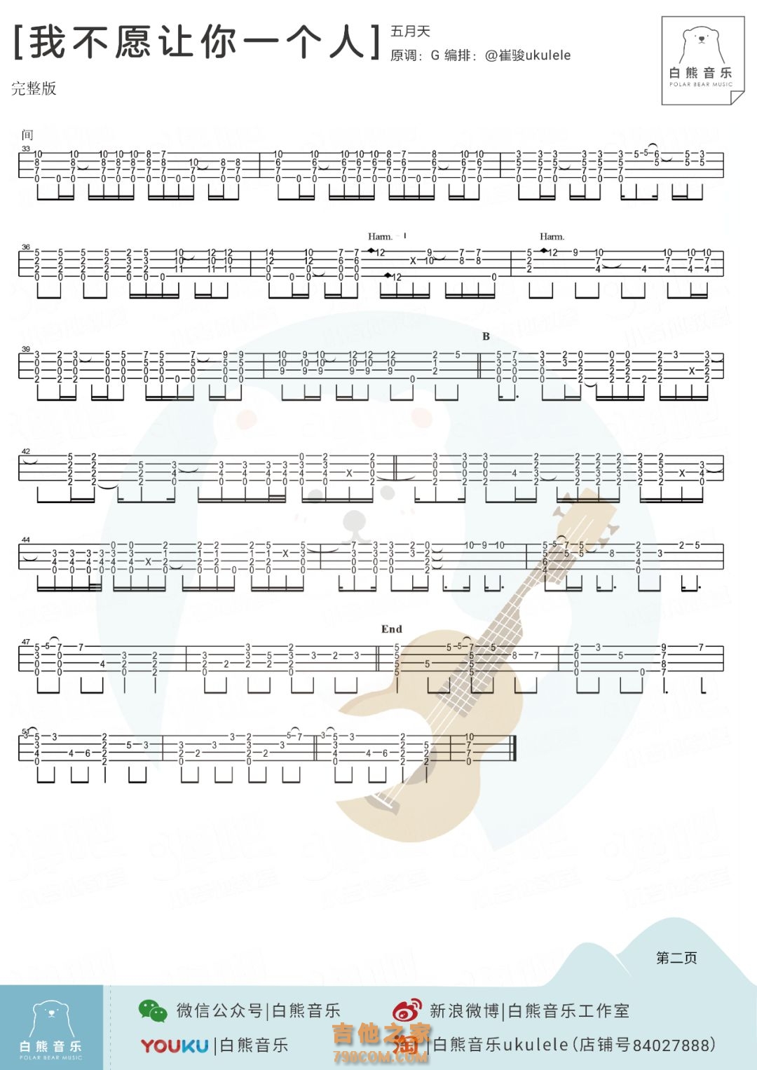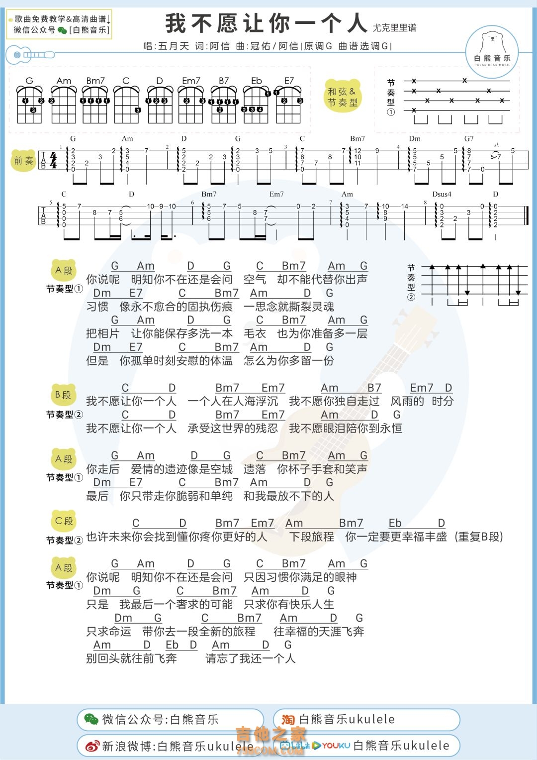 我不愿让你一个人尤克里里谱教学视频 五月天【白熊音乐】 我不愿让你一个人尤克里里谱 五月天【白熊音乐】 〈我不愿让你一个人〉是由阿信填词,阿信和冠佑作曲,五月天演唱,收录在其2011年发行的专辑「第二人生」中。 歌曲旋律温暖,该MV在台湾区YouTube的点阅率超过千万人次,这首歌在五月天演绎下,传递活在当下、把握今天,才是最好的人生态度。 阿信看到世界各地天灾人祸接连不断发生,惊觉“末日”其实与生活只有一线之隔,于是以世界末日为主题创作了这首歌曲。这首歌将五月天对传说中的“末日”的感悟融入其中,表达了人生最重要的就是珍惜,活在当下把握今天才是最好的人生态度。作为第八张专辑《第二人生》首波主打歌,《我不愿让你一个人》还借2012的末世传说特别打造了明日版和末日版,传递了若果还有明天以及如果没有明天的两种感触。 我不愿让你一个人尤克里里指弹谱 五月天