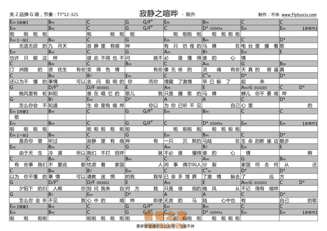 陈升《寂静之喧哗》和弦吉他谱【飞啦不休】 弹唱谱: 陈升2018年专辑“无歌之歌”里的一首,试着编了一下,断句一如既往的头疼,这也是陈升唱歌的特点吧。和弦有一些离调,还是挺有意思的,编曲能对上这样随意的唱腔也是很强哈哈。 参考节奏里的T-拇指拨根音,T4-拇指拨四弦,1-食指拨三弦,2-中指拨二弦,3-无名指拨一弦。 啦啦啦啦啦 无语无欲的九月天 寂静里有喧哗 有一只彷徨的马蜂 在电台里播着歌 也许只能这样 彼此不闻也不问 就不必谁懂得谁的心情 汀洲路的资优生 有些变得色情 有些像无依的灵魂 有些天真的很逼真 还以为不懂的事情 可以去问聪明的你 而你埋葬了激情 早已躲了起来 晚风里有轮斜阳 谁在唱他的歌儿 我只是播歌的马蜂 蝉儿你不要喧哗 怎么你会不知道 生命里有喧哗 你以为你已听不见 自己心里的歌 啦啦啦啦啦 ... |