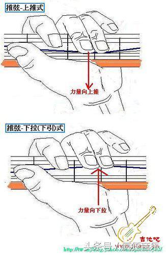 (图:B.B.King,图中的吉他為Gibson製B.B.King代言"Lucille") *上推&下拉(下引) 推弦其实不光只有"推"这个动作,為了配合弦的位置,因此也会用到"拉",不过因為產生的声音都一样,所以并没有差异之分。 上推:碍於指板演奏空间,因此通常用在123弦。 下拉(或下引):通常用在456弦,原因同上。 以下就是上推与下拉的图例: