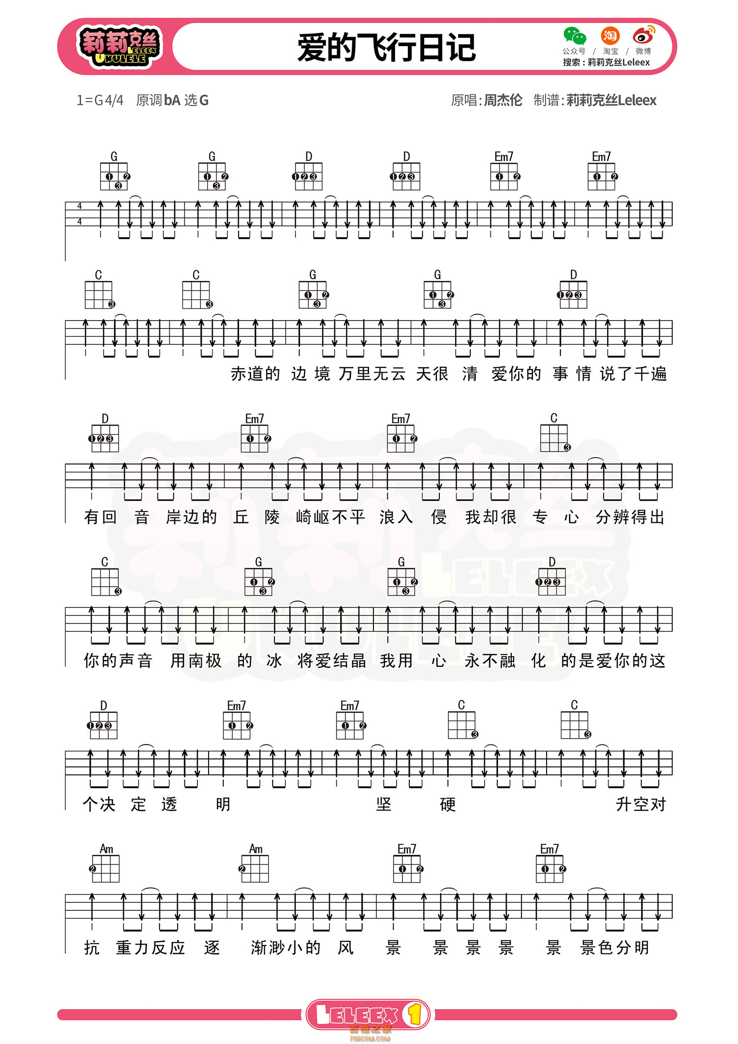 周杰伦《爱的飞行日记》尤克里里弹唱曲谱(标准版)初级难度