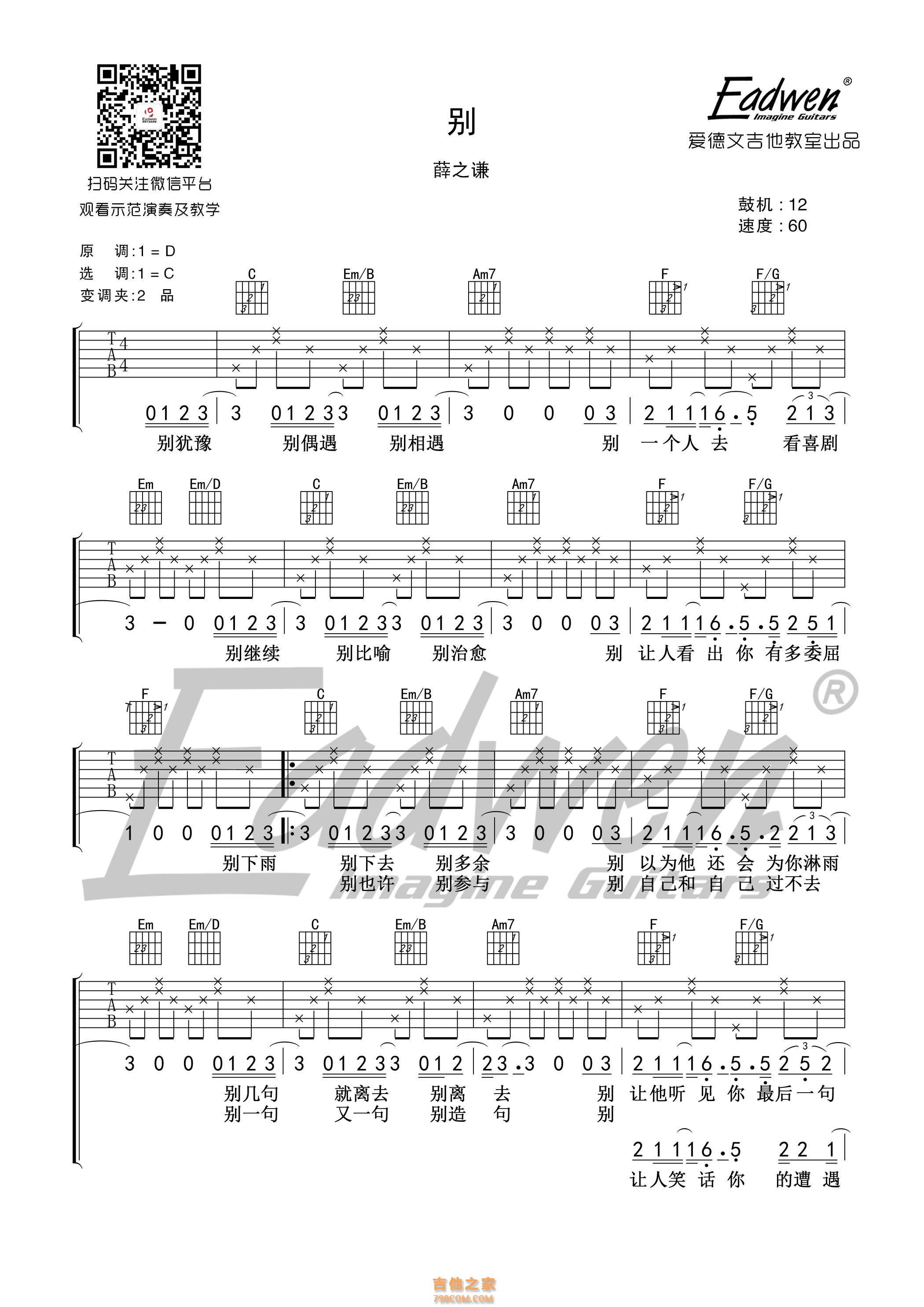 《别》别吉他谱 薛之谦 C调爱德文吉他教室出品