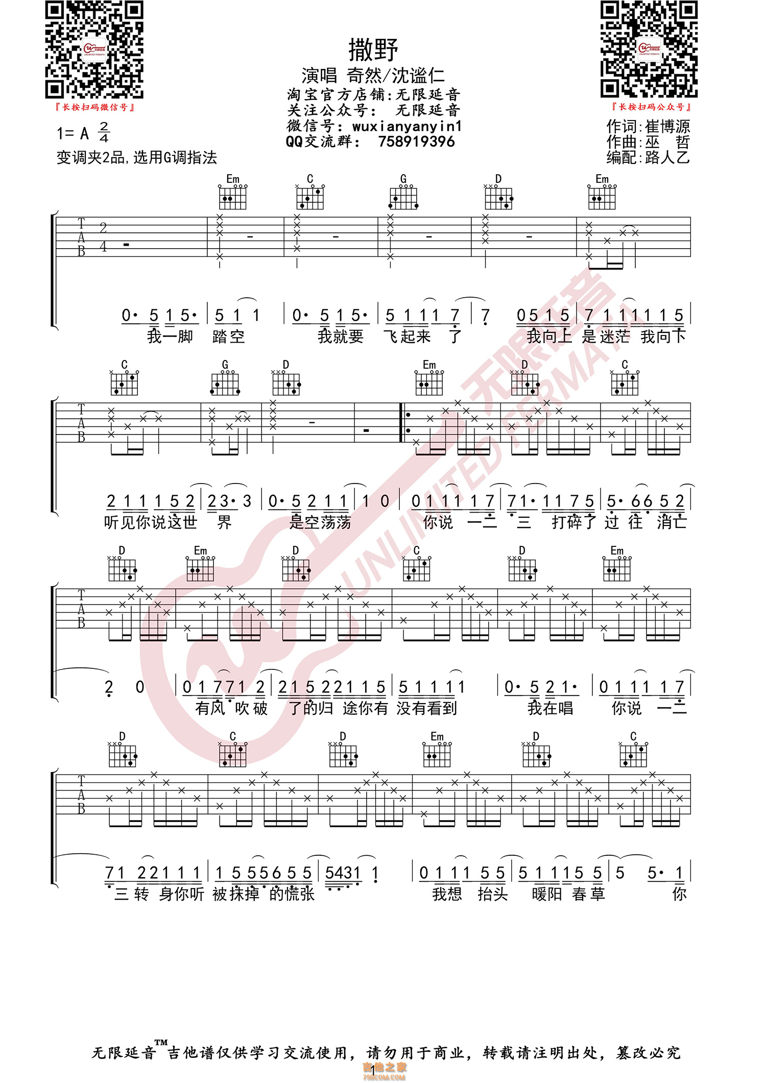本章为“奇然/沈谧仁 撒野 吉他谱 无限延音编配 ”信息,了解更多高清无码版本吉他谱、尤克里里、教学视频等信息,请关注吉他之家,我们会持续更新。