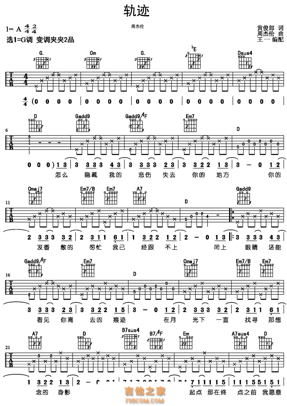 本章为“《轨迹》吉他谱 周杰伦 G调高清弹唱谱 ”信息,了解更多高清无码版本吉他谱、尤克里里、教学视频等信息,请关注吉他之家,我们会持续更新。