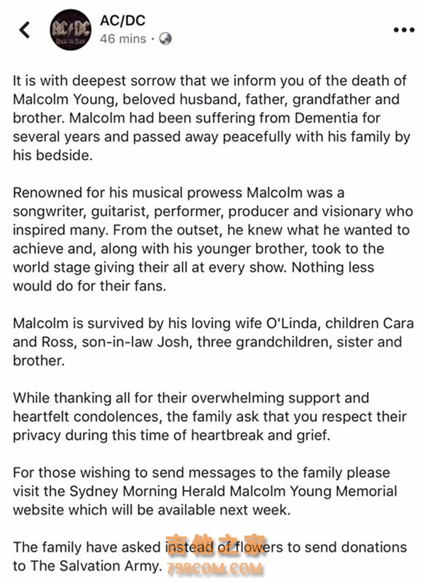 来自澳大利亚的硬摇滚乐队AC/DC前吉他手、乐队创立者之一的Malcolm Young今日去世,他的家人称,他在这周六安详去世,终年64岁。