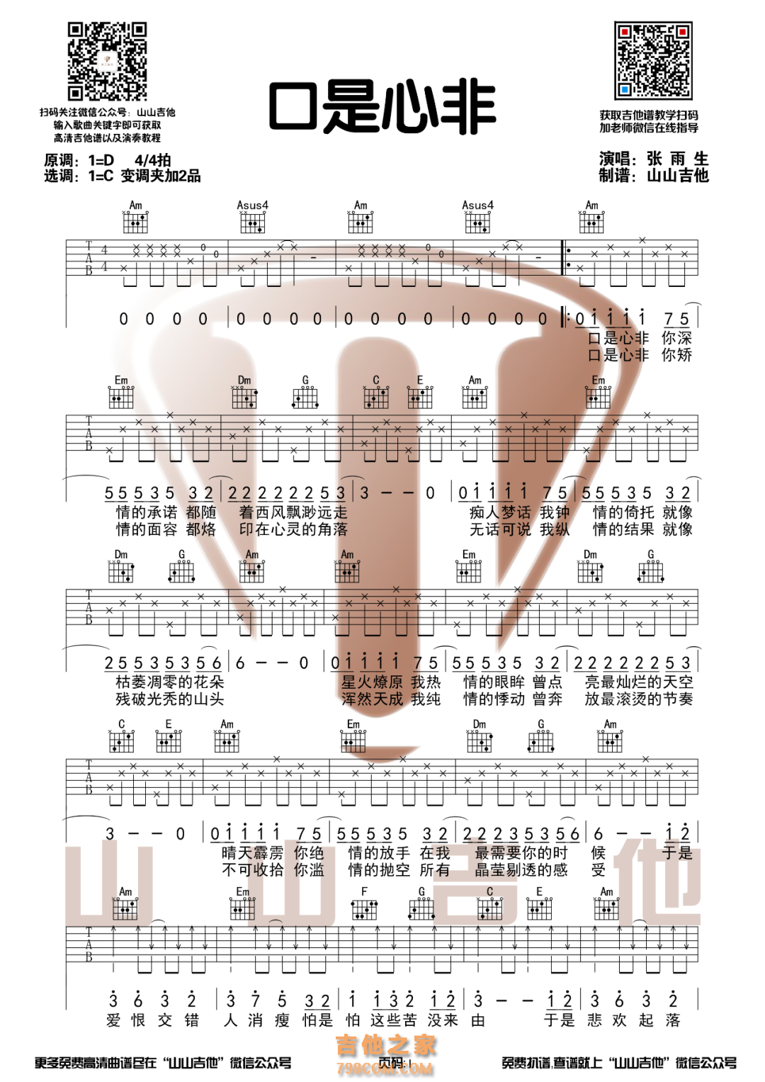 | 《口是心非》是由张雨生作词作曲并演唱的一首歌,收录于同名专辑《口是心非》中 ,为著名歌手张雨生去世前的最后绝唱。1998年,获得第9届台湾金曲奖最佳流行音乐演唱唱片奖。 张雨生《口是心非》C调原版吉他谱 |