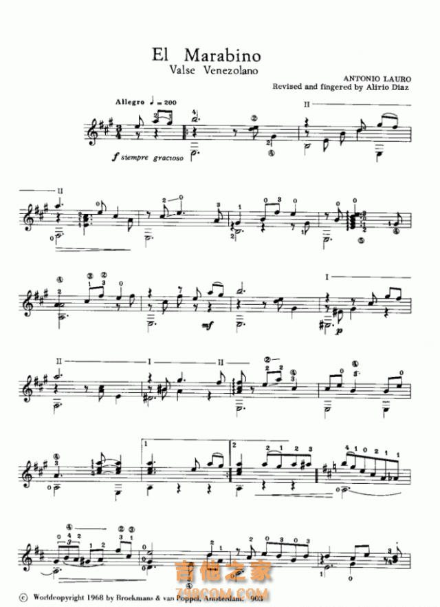 马拉开波(Marabino或Maracucho)是委内瑞拉苏利亚州首府马拉开波(Zulia,Maracaibo)的一种土著人,从这部作品看,劳罗好像在马拉开波住过一段时间。这首短小的委内瑞拉圆舞曲描述了马拉开波人“勤劳、智慧、活力奔放的特征,特别是对居住在这边土地的自豪感”。劳罗还有一些不太知名,但也很给力的圆舞曲作品,如Petronila(1936)、La Gatica(1955)、Momoti(1975)、Maria Carolina(1983)等。 收录马拉开波舞曲的唱片数:78 推荐录音版本: Adam Holzman, 2000年Naxos唱片,8554348 Pepe Romero,1991年Philips唱片,432012-2 David Russell, 1980年吉他大师唱片,GMR 101-93 |