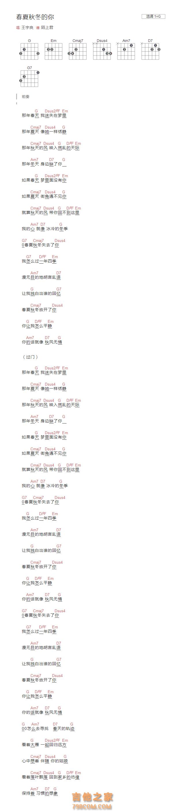本章为“春夏秋冬的你吉他谱G调和弦版 王宇良 ”信息,了解更多高清无码版本吉他谱、尤克里里、教学视频等信息,请关注吉他之家,我们会持续更新。