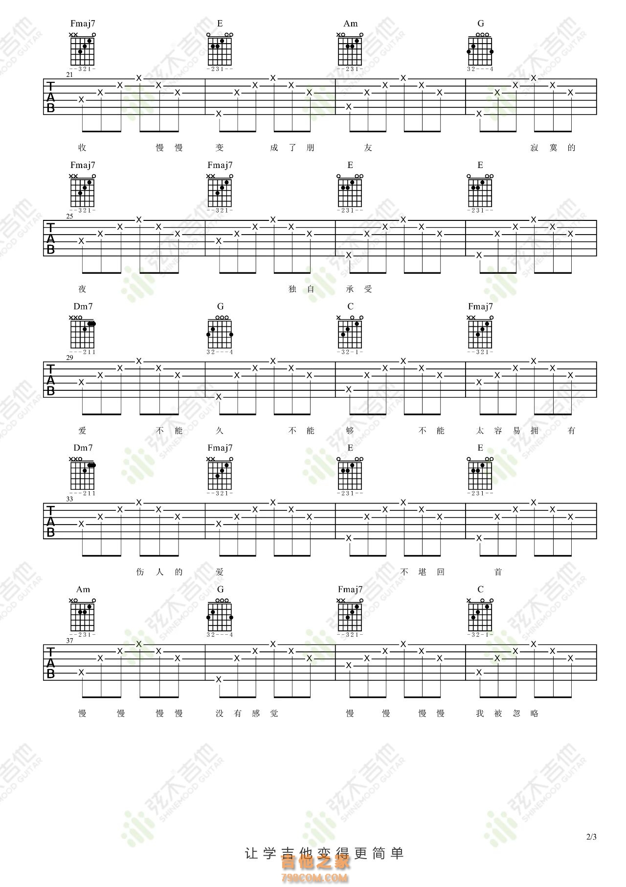 张学友《慢慢》吉他弹唱谱 《慢慢》是由歌神张学友演唱的歌曲,收录在专辑《忘记你我做不到》。张学友,1961年7月10日生于香港,作为一位在亚洲地区和整个华人社会都具有影响力的实力派音乐巨星和著名电影演员,香港乐坛“四大天王”之一,这首《慢慢》也是他众多经典歌曲当中的经典。