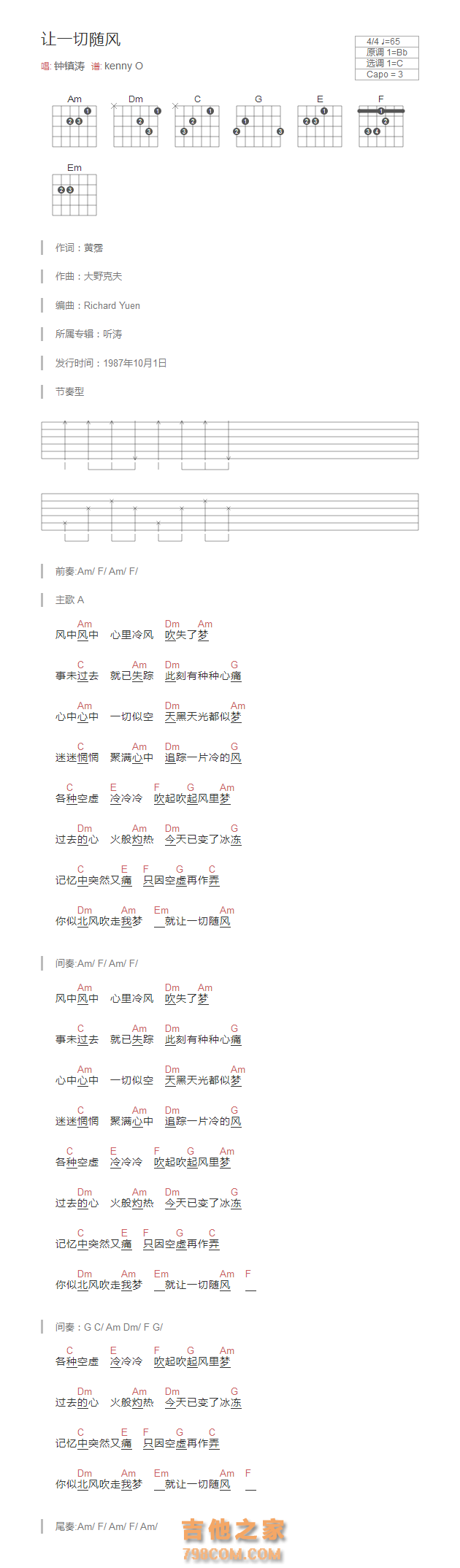 本章为“让一切随风吉他谱和弦版 钟镇涛 ”信息,了解更多高清无码版本吉他谱、尤克里里、教学视频等信息,请关注吉他之家,我们会持续更新。