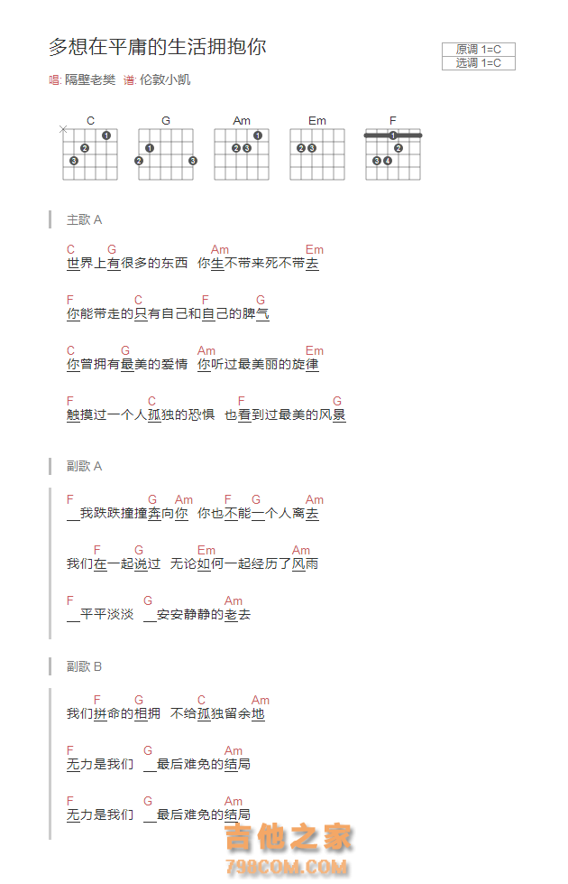 吉他之家为您提供:多想在平庸的生活拥抱你吉他谱C调和弦版 隔壁老樊 ,查看更多多想在平庸的生活拥抱你吉他谱C调和弦版 隔壁老樊 图片谱、C调吉他谱、D调吉他谱、E调吉他谱、F调吉他谱、G调吉他谱、A调吉他谱、B调吉他谱、TXT吉他谱版、GTP吉他谱版、多想在平庸的生活拥抱你吉他谱C调和弦版 隔壁老樊 简谱、多想在平庸的生活拥抱你吉他谱C调和弦版 隔壁老樊 尤克里里谱、六线谱、五线谱、吉他和弦谱及多想在平庸的生活拥抱你吉他谱C调和弦版 隔壁老樊 吉他教学视频,请查看下方"相关阅读"。