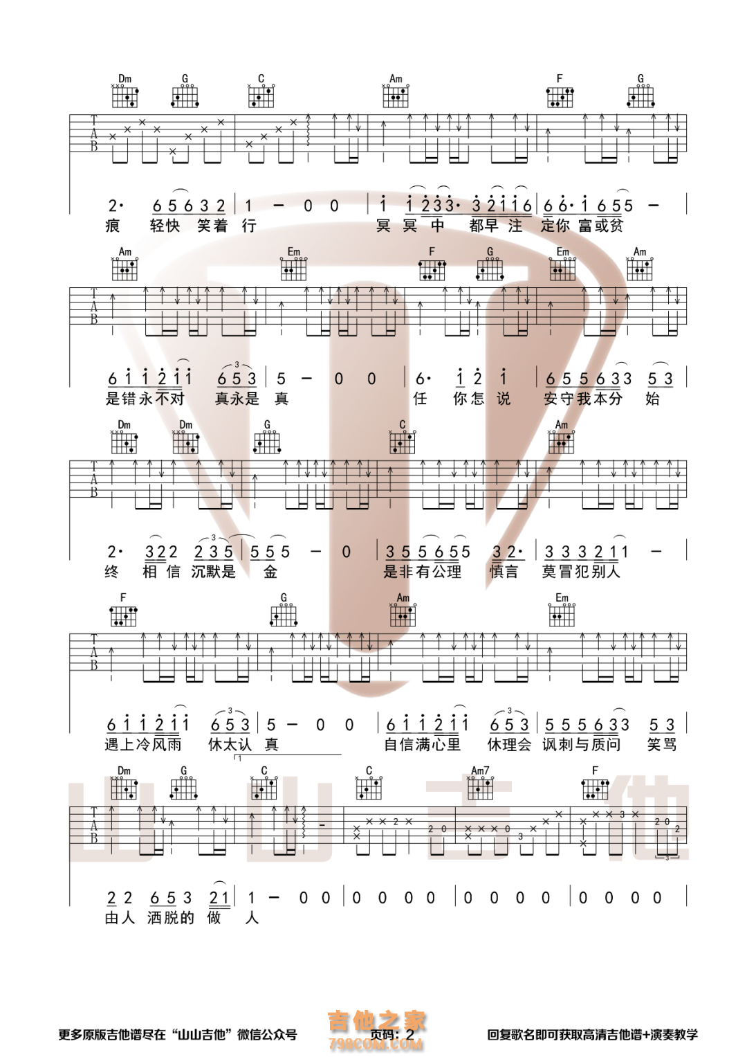 这首歌曲是张国荣与许冠杰两代歌坛天王合作的经典之作。由张国荣作曲,许冠杰填词,曾获得1988年“十大中文金曲奖”和“十大劲歌金曲奖。 当时正值谭张争霸最激烈之时,两方粉丝掐架得厉害,有人用很不堪的言语诋毁他。在心力交瘁的时候,哥哥与许冠杰写下了这首对于人生的感悟之曲,也告诉了大家做人的道理,笑骂由人,洒脱的做自己便好! 吉他谱选用C调和弦编配,编有简单的前奏,整体难度不大,适合新手练习。