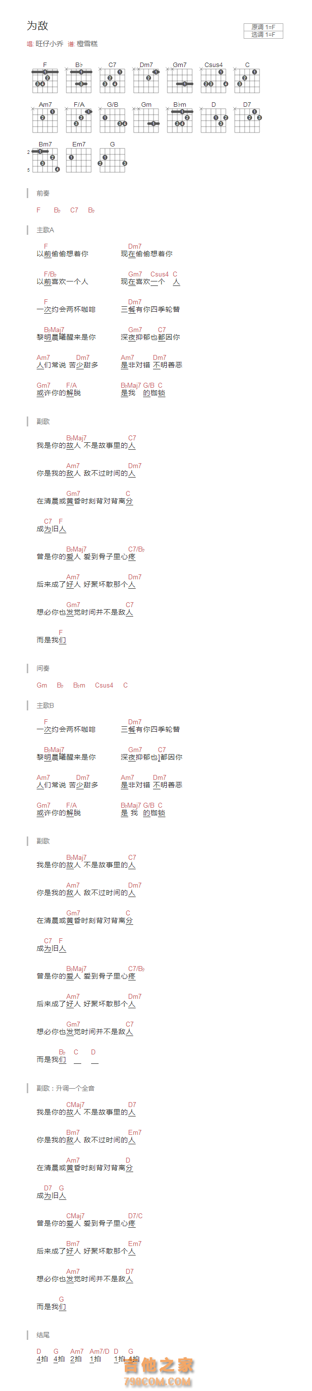 吉他之家为您提供:为敌吉他谱F调和弦版 旺仔小乔 ,查看更多为敌吉他谱F调和弦版 旺仔小乔 图片谱、C调吉他谱、D调吉他谱、E调吉他谱、F调吉他谱、G调吉他谱、A调吉他谱、B调吉他谱、TXT吉他谱版、GTP吉他谱版、为敌吉他谱F调和弦版 旺仔小乔 简谱、为敌吉他谱F调和弦版 旺仔小乔 尤克里里谱、六线谱、五线谱、吉他和弦谱及为敌吉他谱F调和弦版 旺仔小乔 吉他教学视频,请查看下方"相关阅读"。