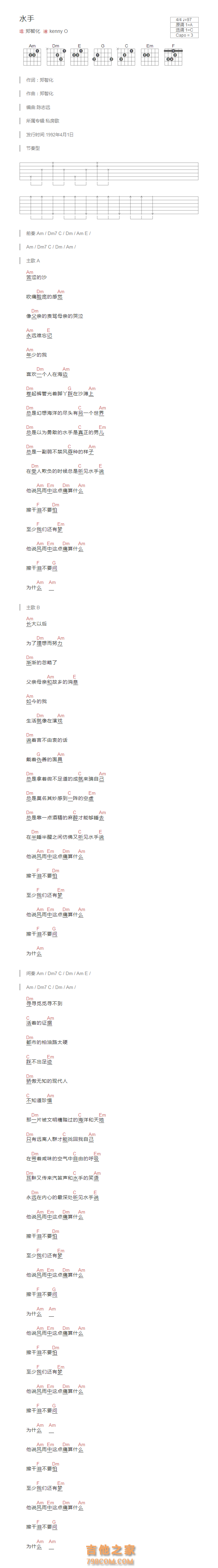 本章为“水手吉他谱和弦版 郑智化 ”信息,了解更多高清无码版本吉他谱、尤克里里、教学视频等信息,请关注吉他之家,我们会持续更新。