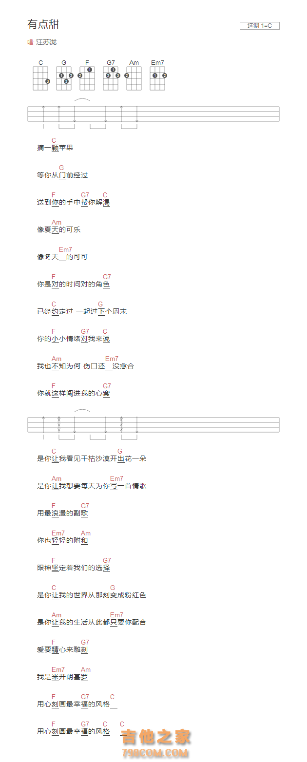 本章为“有点甜尤克里里谱 汪苏泷 ”信息,了解更多高清无码版本吉他谱、尤克里里、教学视频等信息,请关注吉他之家,我们会持续更新。