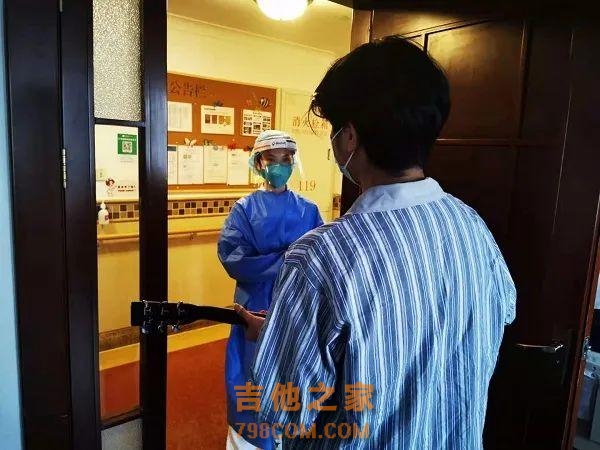 来源/仁济医院西院区供图(下同)(为保护隐私,小亮脸部打上了马赛克) 1月21日,接到紧急通知,因疫情防控需要,仁济医院西院区实施封闭式管理。这意味着小亮将和医院所有人一起,在医院接受观察14天,其间他无法见到自己的爸爸妈妈。知道这个消息的小亮没有过多的紧张,一边配合医护人员的工作,一边志愿协助医护人员安抚病房的两位患者及其家属。 消化内科病房目前共住着多名在院患者和个别陪护家属。很多患者本身会伴有发热症状,这容易让人产生一定的紧张情绪。和小亮同住一间病房的,是一位60多岁的阿公和另外一位外地患者。因为炎症的原因,两位患者都有点发烧,也因此出现了不同程度的紧张焦虑情绪。 小亮是病房的“开心果”,积极开朗的他不断安慰病友们。他和大家聊天,和大家分享好玩的新闻。他还拿出电脑,和阿公一起看谍战片。尽管只能远远地坐着,但是病房里的气氛却一点点好了起来。 虽然是开心果,但是小亮却偷偷想念自己那把心爱的吉他。弹吉他,是小亮平时紧张学习之余仅有的爱好之一。小亮的妈妈在了解到医院的物资管控原则后,将吉他送到了医院外指定的物资收集点,随后由志愿者在固定时间将吉他送进了医院。