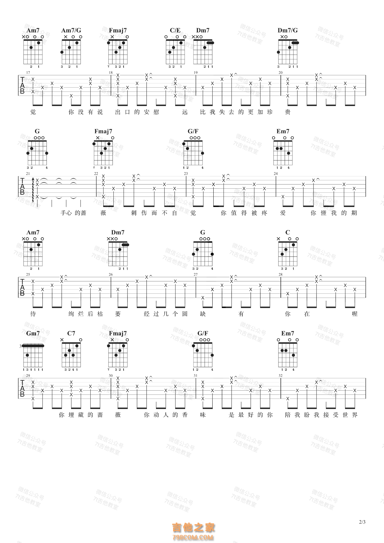 | 这首歌的原调是G大调,我用的是C大调的指法来编配(视频里是降半音调弦)。这个谱子不适合弹原调哦,因为原调需要夹太多品 和弦分析 首先讲一下比较基本的,把一些三和弦丰富一下,二级、三级、六级大部分用了小七;四级用了maj7;五级用了属七;结尾的一级用了sus4…… 主歌部分,以主和弦C开始后,直接用了251进行,并且在回到一级之后,紧接着串联 1 → 5/7 → 6m → 6m/5 → 4 → 1/3 → 2m →5 这样一个经典的卡农走向,这里面有几个斜杠和弦的运用,使得低音部分有一个顺畅的下行,这种方法很常用,在《和弦乐理课程》已有总结。 副歌部分,就是两遍的4536251,并且在两遍之间用了 Gm7 → C7 → Fmaj7 这个251离调的方法。 林俊杰 / 邓紫棋《手心的蔷薇》吉他谱