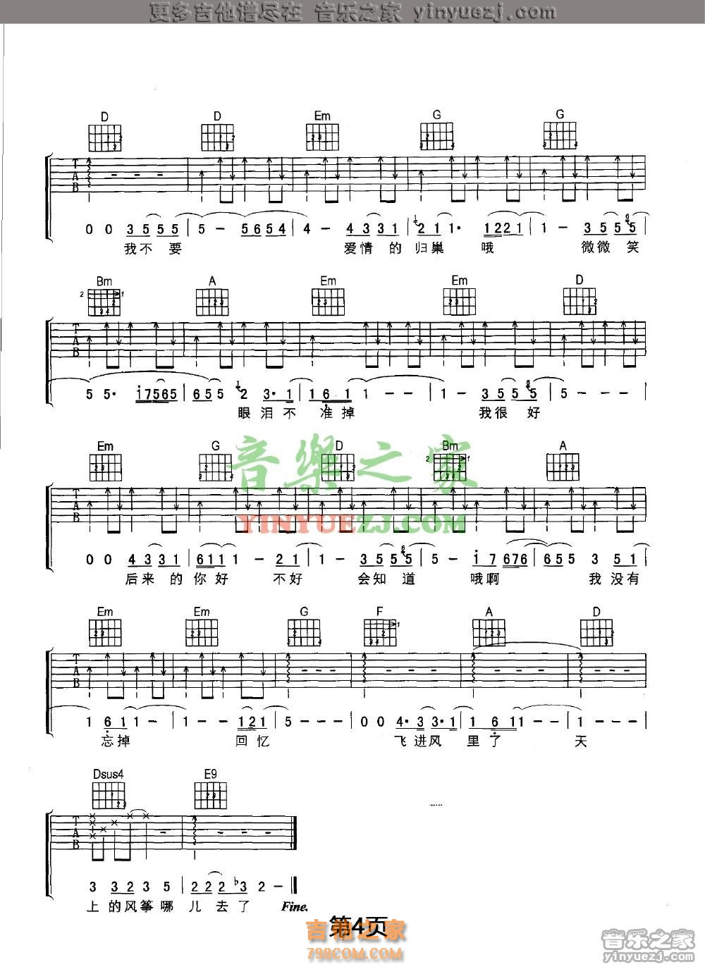 本章为“孙燕姿《风筝》吉他谱 ”信息,了解更多高清无码版本吉他谱、尤克里里、教学视频等信息,请关注吉他之家,我们会持续更新。