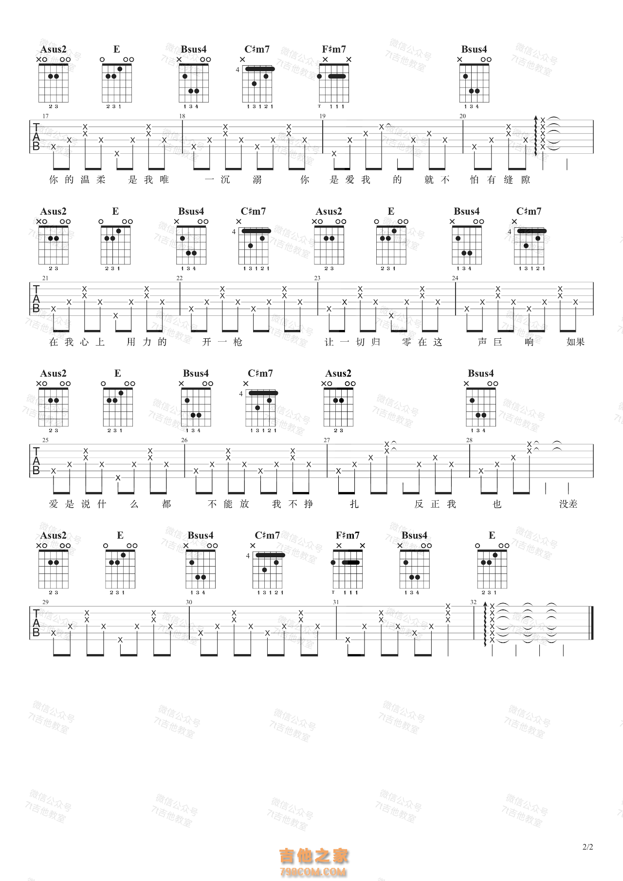 | 本期带来张惠妹《人质》的女生降调版本,这首歌的原调是Ab大调,我用的是E大调的指法来编配,演示视频里是标准音调弦,变调夹夹在第1品。想弹原调的小伙伴夹第4品就可以哦~右手节奏型方面大家可以自由发挥,因为有很多种节奏型都能把同一首歌弹得很好听,不必完全按照谱子上的来弹哦!尤其是初学者如果觉得谱子的节奏型太难,完全可以用最基础的节奏型来代替~ 张惠妹《人质》吉他谱