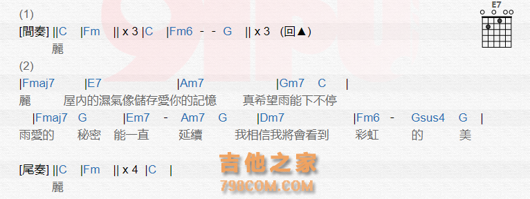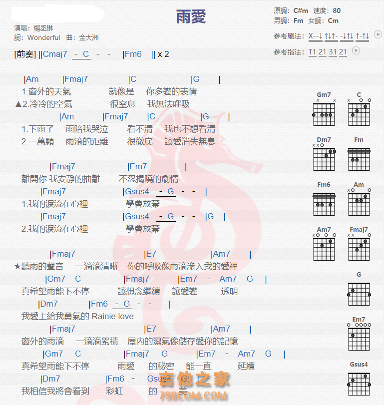 本章为“杨丞琳《雨爱》吉他谱分享 ”信息,了解更多高清无码版本吉他谱、尤克里里、教学视频等信息,请关注吉他之家,我们会持续更新。