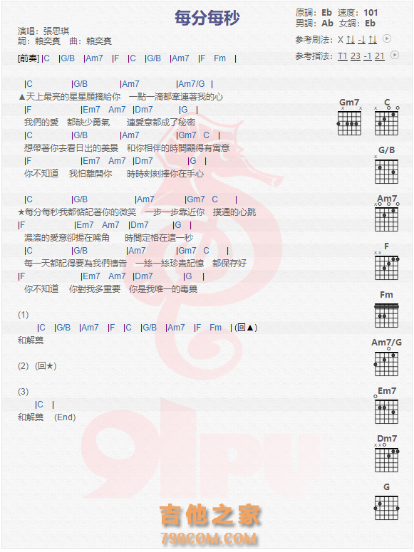 本章为“张思琪《每分每秒》吉他谱分享 ”信息,了解更多高清无码版本吉他谱、尤克里里、教学视频等信息,请关注吉他之家,我们会持续更新。