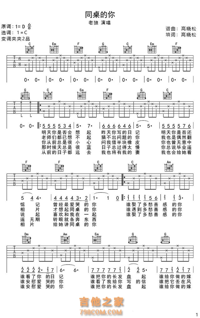 各位热爱音乐和吉他的朋友们,可以对照谱子和音频来演奏。原调D调,本谱采用C调,变调夹需夹2品。以下是老狼的《同桌的你》音频欣赏: