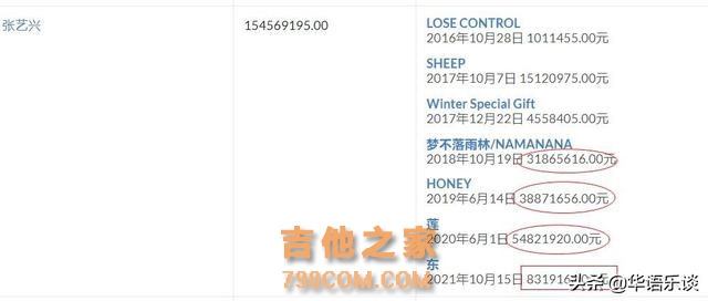 他的作品销量基本都是几百万居多,偶尔有一两千万就到顶了。所以只能靠勤奋出歌,积少成多了。如今他终于冲进了前五,而在之前流量狂欢的时期,他很难进入前十。 张艺兴 张艺兴的总销量跟林俊杰相差不大,但他只有7张专辑(单曲),所以平均销量表现肯定是强于林俊杰的。 在我看来,张艺兴跟蔡徐坤是同类型歌手,实力是有的,努力也是看得到的,只是并非天赋异禀型选手,立的是“原创音乐才子”人设,而其可观的销售成绩,更多还是来自于流量的因素。