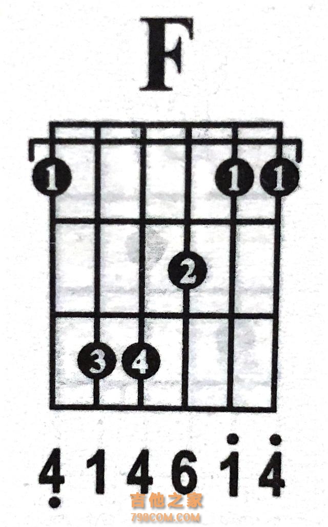 C和弦 下图是F和弦的乐谱标记和实际按弦效果,F和弦属于大横按和弦,1指需要把1品6根弦(最少1,2,6弦)全部按住。