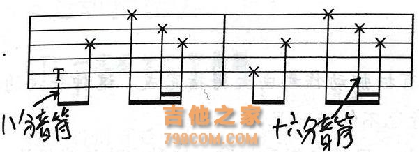 上面是简谱,其实六线谱也是一样的,我们来看,图A是分解节奏,图B是扫弦节奏,表示方法如下,拍子表达方法和简谱五线谱一样,音符底下加下划线,不加线的是四分音符,一条线的是八分音符,两条线的是十六分音符,以此类推。