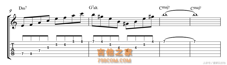 重要的话说三遍:这是一套系统课程,这是一套系统课程,这是一套系统课程。千万不要就看这其中的一篇来瞎逼逼,一定要从头开始学,一篇一篇的认真学,真正掌握了你会发现,太爽啦。如果只是拿其中一篇来研究,那无异于盲人摸象。这套系统我其实从12年就开始接触了,其实中途也放弃过好几次,因为实在是信息量太大啦,尤其是前面的牛逼基本功:251和弦的素材练习,太磨人啦。不过,只有你到了乐句的练习,你才会发现,这是一个非常完整的系统,没有一点多余的成分,也不能挑着练,一定要一步步把他全部拿下,相信我,那个时候你才有内功去吸收其他的东西,才可能随便拿一篇来看就能明白,至少大致能明白,好了,就铺垫这么多,我也要着手准备我的网络课程啦,也希望我们的粉丝朋友发发力啊。谢谢。 乐句的练习,其实不在太多,因为一个人也记不住那么多,我老师说他自己也只能记一百条左右,然后就是各种混搭各种杂交,就完全够用啦。 所以,乐句的学习一定要建立在分析的基础上,这样你才有可能自己创造出自己的乐句。我们先来看看谱例: ![]() 自制谱例 我们先来分析一下第一个小节,第一个小节第一个音实际上就是我们上一次讲的Guidetone,只不过这个是7音。前两拍就是一个Dm7和弦的琶音。然后第三拍到第四拍的前半拍都是一个正常的Dorian音阶而已。 而第四拍的后半拍我们一般称之为经过音,这种用法经常会在乐句里面出现,他的目的就是为例链接下一个和弦G7alt的Guidetone,也就是B音。第二个小节的前两拍正好是一个Adim7琶音,我们前面讲G7alt的时候专门讲过。第二个小节的最后一个音,也是经过音,也是为了链接下一个小节的Guidetone,也就是E 音。 经过音其实在古典音乐里面就有了,在现代音乐里面只是借用过来而已。我们再来看一条谱例: ![]() 自制吉他谱 这句也都差不多,值得说的第一个小节第一个音,是从Dm7和弦9音开始的,9音是个非常漂亮的音,我记得我看过Nill zaza的一个教学视频,他说也非常喜欢用9音。还值得说的一个位置就是第二个小节的第三拍,在爵士乐句里面也经常这么用,你甚至可以多练习一下这个位置。其他地方就可以对照第一个乐句去分析就可以啦。 给第三个乐句出来,你可以用上面的方法自己去分析一下: ![]() 自制吉他谱 最后一定要开伴奏,然后把251写进去,你就可以用这两句玩玩啦。玩熟了之后,试着去混搭一下,听起来效果也不错。 今天就酱紫,再会。祝你好运。 |