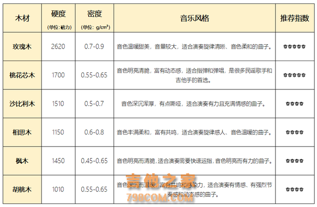 影响吉他的部件很多,普通的吉他爱好者很难全部吃透,其实我们只需要看以下几方面: (1)面板优先云杉木 面板木材主要有云杉、红松、相思木、桃花芯木、沙比利木等。云杉木虽然价格相对较贵,但它木纹清晰、音色大气浑厚,层次丰富,清晰度高,可以产生更温暖、更柔和的音质,能更好地把控演奏的力度和强度,特别适合演奏民谣、弹唱和轻音乐等风格,是吉他面板效果最为出众的一种木材,建议优先选择。其中,西提卡云杉的综合性好,大多数品牌也将作为首选的面板材质。 (2)背侧首选玫瑰木/桃花芯 市面上吉他的背侧板主要以玫瑰木、桃花芯木、沙比利木、相思木、枫木、胡桃木等硬木为主,主要也是从吉他的稳定性方面考虑。