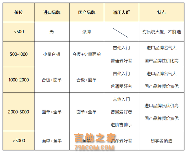 (1)低于2000元的全单不要碰 前面说过,全单吉他的各方面成本都要更高,售价也更高,同品牌的面单和全单价格差距往往很大。 可能有人会问,那怎么解释市面上还有千元左右甚至几百元的面单呢?其实如果仔细看文章,就会明白,“面单”可以很便宜,但一款优质的面单绝对不便宜。 很多人仅仅因为听说全单好就想要买全单,不良商家瞄准这一点,用劣质的原料,粗糙的做工拼凑出一款字面意义上的“全单”,乍一看,它确实是“全单”,但实际使用起来,这个劣质的“全单”可能连一款普通的合板琴都不如。 下图是根据我对吉他市场的了解,将不同预算范围的吉他类型做的粗略统计。