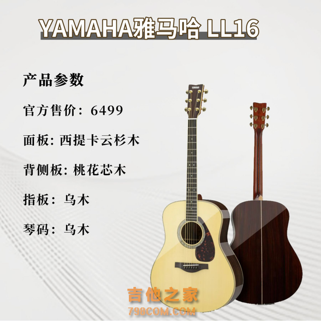 DOPHN A810这款面单吉他延续了品牌优良做工和高性价比的特点,选材优质,吉他音色通透清脆,有穿透力,延音和共鸣效果都非常优秀。品牌在全单类型的产品上做工有显著提高,弦距合适,手感舒适,指弹和弹唱都能完美驾驭,而且品控严格,单品的差异不明显,加上价格很接地气,用户反馈很不错。 (2)YAMAHA雅马哈LL16 ¥6499