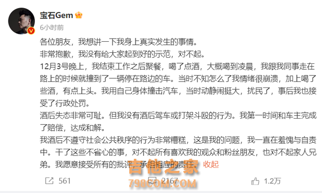 今天0时许, @宝石Gem 在社交平台回应: “没有给大家起到好的示范,对不起。” 他讲述了当天发生的事情, 承认自己酒后失态, 但否认酒后驾车、打架斗殴, 也接受了行政处罚, 愿意接受所有的批评, 承担相应的责任。