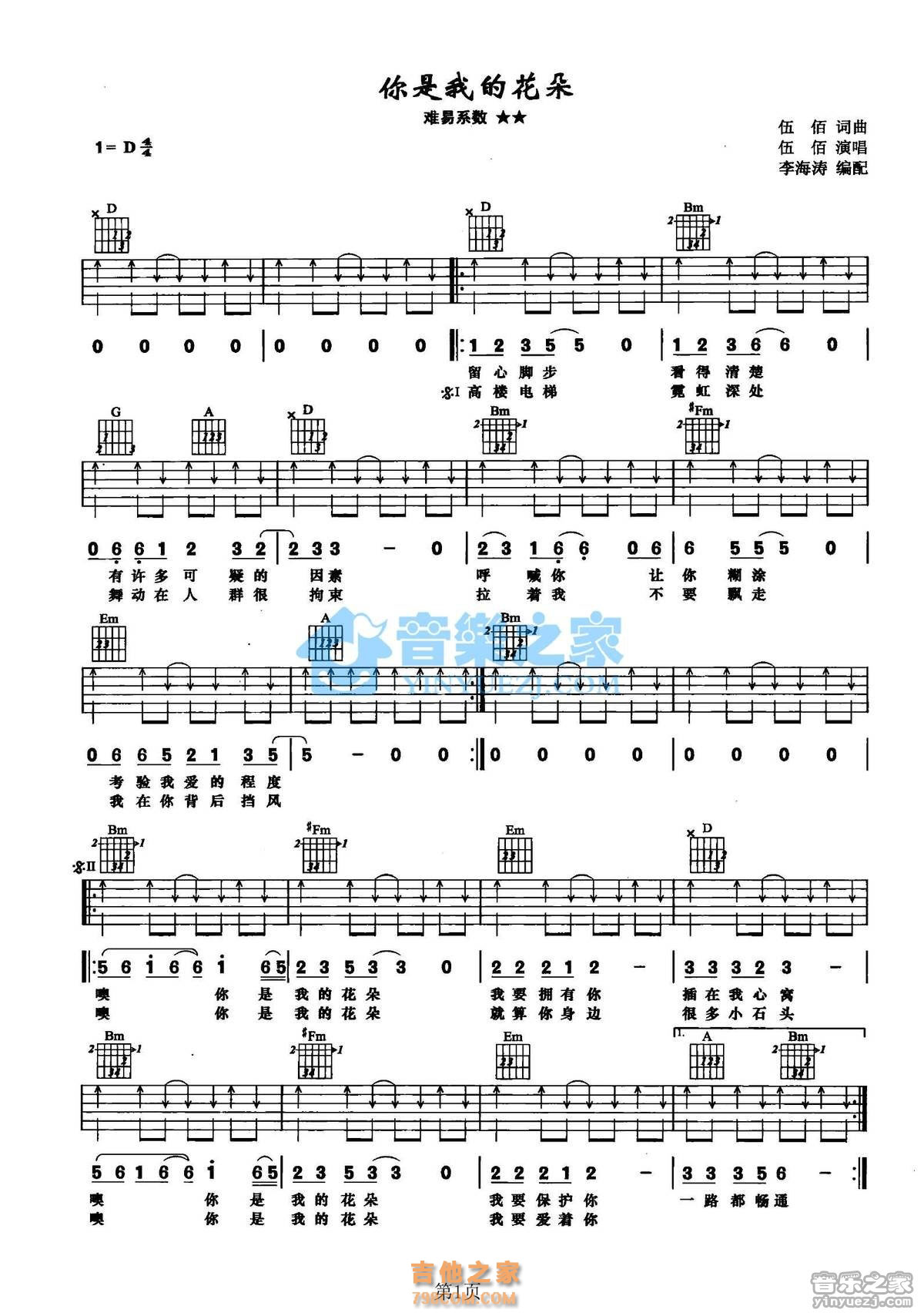 本章为“D调版伍佰《你是我的花朵》吉他弹唱六线谱 ”信息,了解更多高清无码版本吉他谱、尤克里里、教学视频等信息,请关注吉他之家,我们会持续更新。