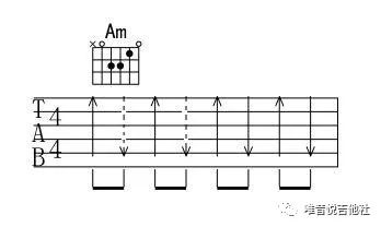 这个练习只要左手按住A和弦,右手在1—5弦匀速的“下扫”和“上挑”就可以了。 基本扫弦节奏型: