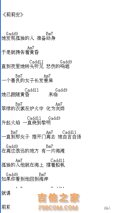 民谣歌手总是有很多优秀且相对小众的原创作品,就像赵雷的好歌远不止《南方姑娘》、《成都》一样,宋冬野也不是只有《董小姐》和《安河桥》,这首《莉莉安》就是我个人非常喜欢的歌, 据说民谣的三大主旋律是远方、姑娘和离别,按照这个说法,这首从歌词到编曲都透着淡淡的伤感的歌,该是教科书式的民谣了, 这个身材比我还圆的男人,有着丰满的才华和厚重的嗓音。 《莉莉安txt吉他谱》 《莉莉安》的和弦谱,网上已经很多了,百度有一大堆,很简单。这里我就发个txt版本,不再重复。 只是间奏部分比较冷门,今天我把它画了出来,弦乐部分用加花替代: