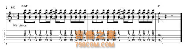 例22: pop风格小十一和弦 例子中的小十一和弦在流行乐中比较常见,例如这种指法就用在了The Police乐队的歌曲《Walking On The Moon》中,还有Bananarama的歌曲《Venus》中。