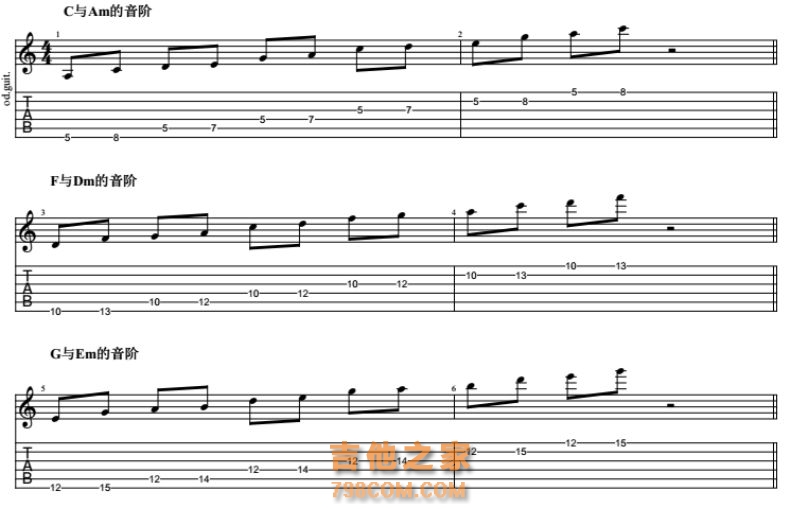 我们知道一组关系大小调能用同样一组五声音阶音阶,所以在我们可以在C和Am 和弦下弹C调的五声音阶,F和Dm和弦下弹F调五声音阶,G和Em和弦下弹G调五声音阶。