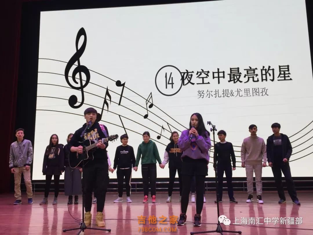 2月14日下午1点,新疆部师生在学校圆形剧场,欣赏了吉他社带来的美妙音乐。整台节目由高二18班吐尔逊和高二16班艾克得主持,社长努尔扎提首先出场,以一曲“一万次忧伤”,唯美而大气,震撼全场,掌声雷鸣。买买提名弹唱思乡之情的“成都”。孜吾皮亚的一曲“当你老了”,委婉动听唱出了时间的流逝。杨丽娜和李诗雨的“说散就散”,唱出了成长过程中因为种种原因说散就散的伤感。孜拉来和艾力库特的“阿拉善”,唱出了平凡、感伤,有些许无奈。把演出推向高潮的是吉他社共同出演,社长努尔扎提和尤里图孜主唱的“夜空中最亮的星星”,全场跟随音乐有节奏的鼓掌。
