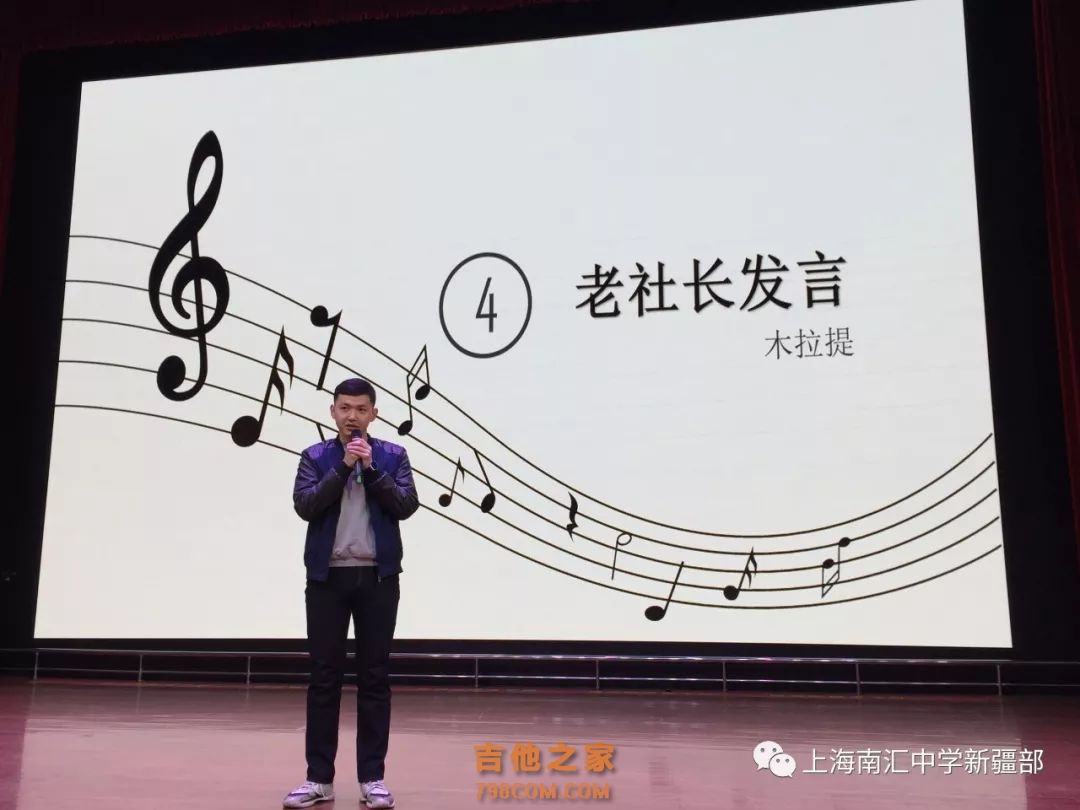 期间,前任吉他社社长木拉提同学祝愿南中吉他社越办越好,蒸蒸日上。大家在幕后制作的小电影,寄予了对现任社长努尔扎提的厚爱,令全场师生感动,更令努尔扎提感动得热泪盈眶。